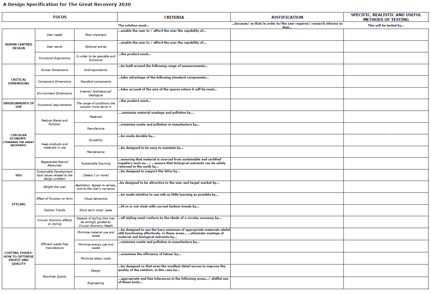 This has functioned very well for previous courses in product design, graphic products, and resistant materials since introduction in 1999. CHanges in courses post 2017 need take into account the need for Human Centred Design and global issues such as Sustainable Development Goals, the creation of a Circular Economy, new disciplines such as UX and UI design. So below is All DESIGN's first iteration of a new specification for The Great Recovery.