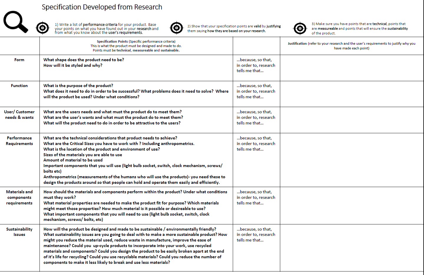 To ensure your specification is as thorough as possible you must create statements that state how the product must function, justify why you have said that by referring back to research, and then also say how you will test this at the prototyping stage.